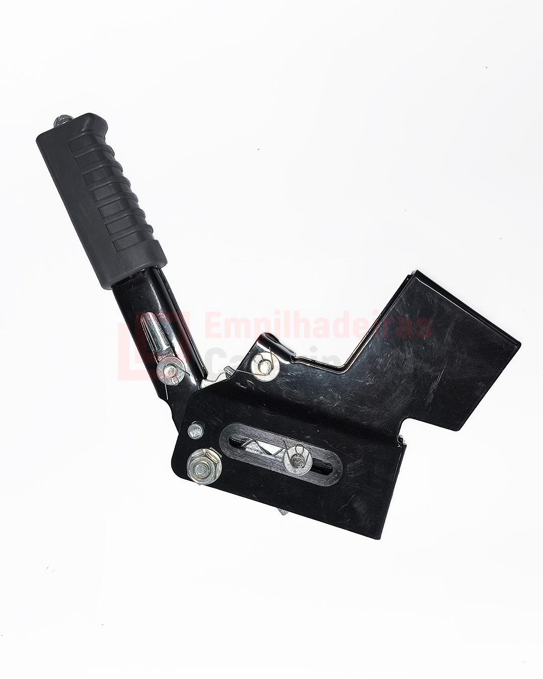 A manete de freio de mão é uma alavanca de comando utilizada pelo operador para acionar funções específicas da máquina, geralmente relacionadas ao sistema de frenagem ou bloqueio de movimento. Sua aplicação garante maior controle operacional, permitindo que o equipamento seja mantido em posição segura durante paradas ou manobras.